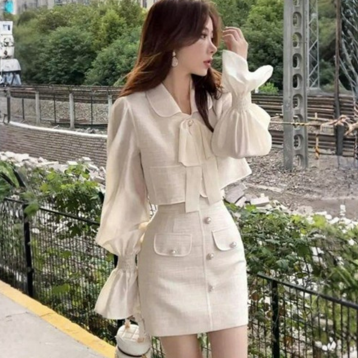 ข้อมูล / รายละเอียด / คำอธิบาย : ชุดเซ็ต 2 ชิ้น สไตล์ “คุณหนูไฮโซ” เนื้อผ้าทวีต/ลินิน (Tweed-like) สีครีมอ่อน ดีไซน์สุดหรูด้วยเสื้อครอปแขนยาวพอง (Puffy Sleeves) ปลายแขนกระดิ่ง มาพร้อมโบว์ผูกคอที่เพิ่มความหวานชวนฝัน กระโปรงสั้นทรงเอประดับด้วยกระดุมมุกสวยเด่น เหมาะสำหรับวันทำงานที่ต้องการความสง่างาม ออกเดท หรือใส่ไปงานเลี้ยงเบาๆ ให้ลุคที่ดูแพงและเรียบร้อยในเวลาเดียวกัน