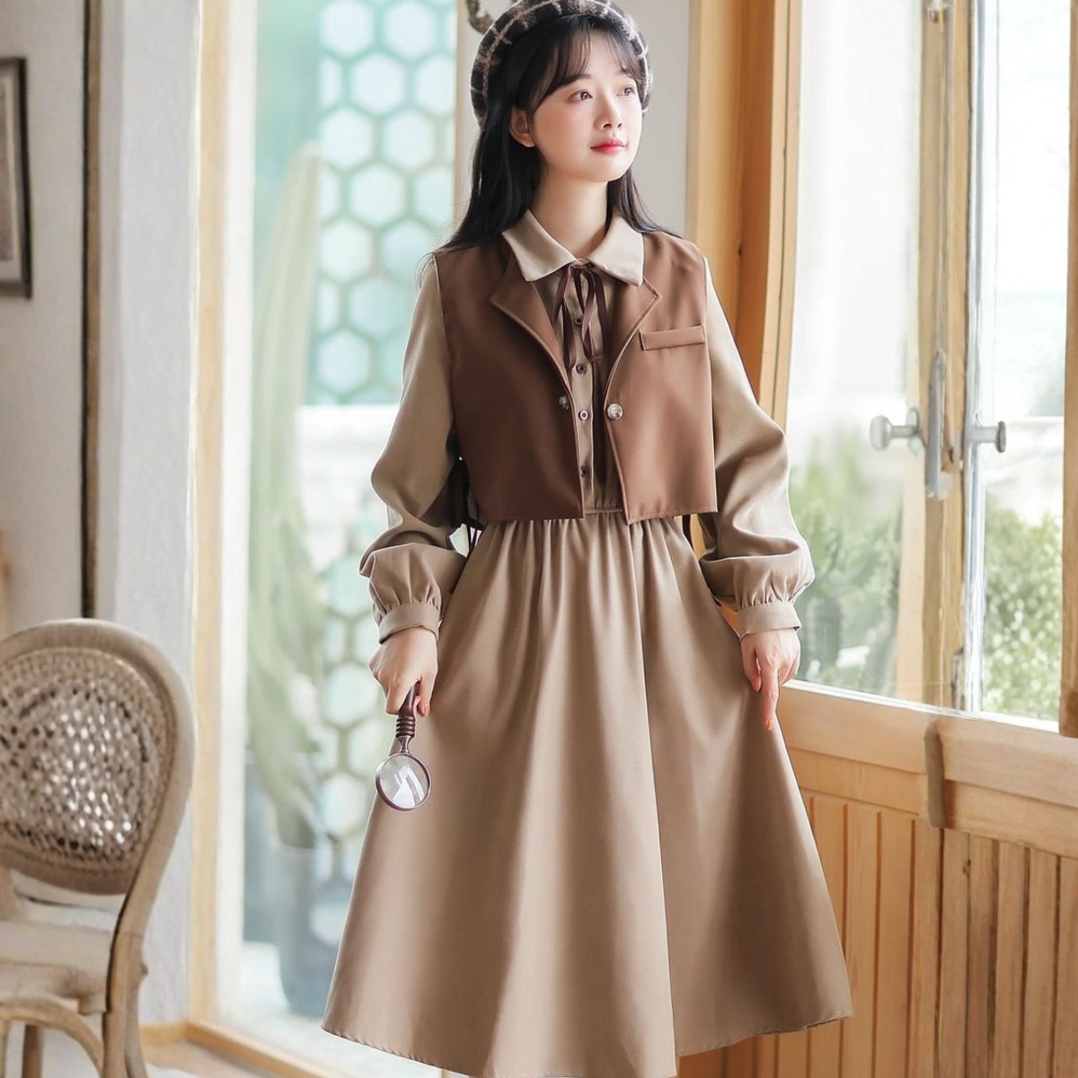 ข้อมูล / รายละเอียด / คำอธิบาย : เดรสแขนยาวแต่งเสื้อกั๊กในตัว สไตล์คาเฟ่เกาหลี ผ้าฝ้ายระบายอากาศดี