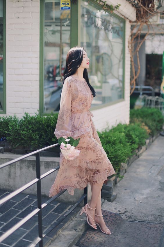 ข้อมูล / รายละเอียด / คำอธิบาย เดรสยาวผ้าชีฟองพิมพ์ลายดอกไม้ สไตล์เกาหลี