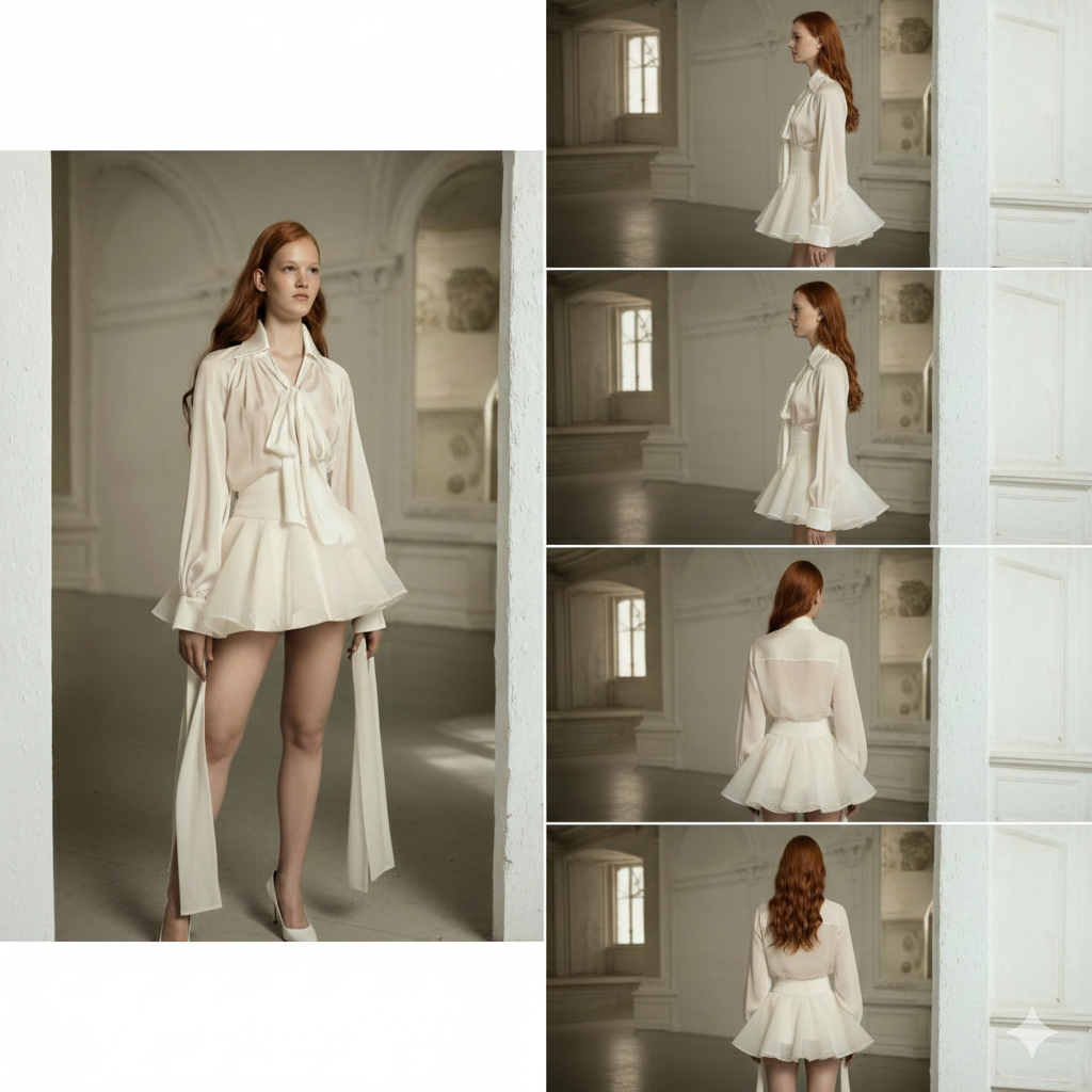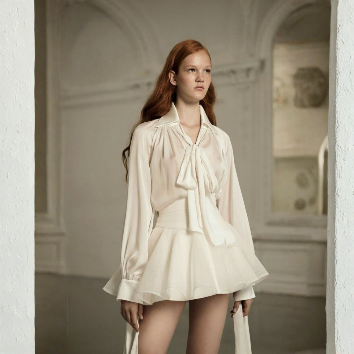 ข้อมูล / รายละเอียด / คำอธิบาย : เสื้อชีฟองแขนยาวปลายบาน ดีไซน์ผูกโบว์หน้า เรียบหรูดูแพง สวมใส่ได้ทั้งลำลองและทางการ เนื้อผ้าบางเบา (Sheer) ทรงหลวม พร้อมดีเทลปกใหญ่และผ้าผูกโบว์ขนาดใหญ่ที่คอ จับคู่กับกระโปรงทรงสั้นสุ่มระบาย เน้นวอลลุ่ม ดีไซน์มีความเป็นแฟชั่นชั้นสูง (High Fashion) หรือเจ้าสาวมินิมอล ให้ลุคที่ดูโดดเด่น หรูหรา และมีพลัง