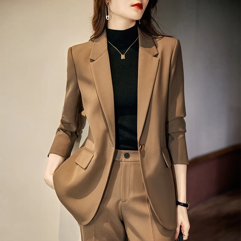 ต้อนรับสายลมหนาวและบรรยากาศใบไม้เปลี่ยนสีด้วยชุดสูทโทนสีน้ำตาลพาสเทล (Earth Tone) ที่ให้ลุคดูเป็นผู้ใหญ่และมีความเป็นมืออาชีพ ตัวผ้ามีความหนานุ่มพอเหมาะสำหรับฤดูใบไม้ร่วง สวมใส่สบายทั้งในห้องแอร์และกลางแจ้ง งานตัดเย็บเนี้ยบทุกจุด ตั้งแต่ปกเสื้อไปจนถึงปลายขา